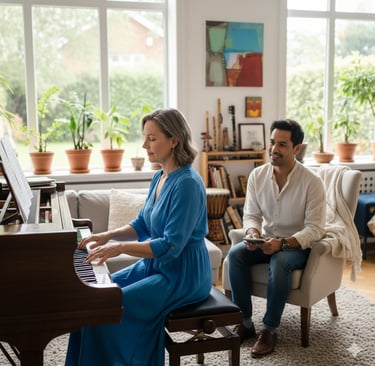 Aprende piano, guitarra, bajo, ukelele o canto a tu ritmo y con atención individual. Sesiones en línea flexibles que se adaptan a tu horario y necesidades personales.
